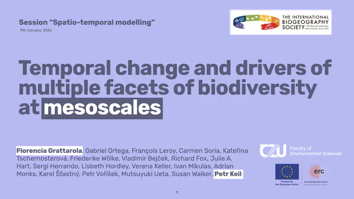 We expect declines, but reported trends and drivers of global biodiversity change vary across taxa, regions, and scales. Most studies focus on a single metric, typically species richness or temporal turnover. They also assess change at either local or global scale, rarely at the intermediate grain, and with limited analyses of the drivers of these changes. Here, we present a near-global study (9 regions across 4 continents) at a novel meso-scale (100–2500 km² contiguous grids), measuring multiple facets of contemporary biodiversity change (species richness, occupancy, temporal and spatial turnover during the past 50 years). We also examine their potential drivers, including temperature, precipitation, human footprint, tree coverage, and cropland area. We account for variation in sampling effort (using Frescalo and Bayesian occupancy models) and we identify both static and dynamic drivers of the change (via Random Forests). We show that 8 out of 9 regions exhibit an increase in mean occupancy per species over time. Most regions are gaining species on average and these changes seem to be driven by temperature, change in temperature and change in precipitation. At smaller grains, we see a weak taxonomic homogenization which vanishes at larger scales. Temporal turnover patterns vary by region and are driven again mostly by changes in temperature and precipitation. Overall, we present the most up-to-date synthesis of temporal biodiversity change and its underlying drivers at a previously underexplored mesoscale.